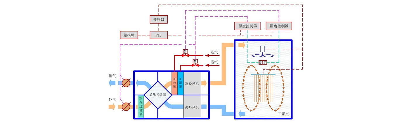 ◆ 進排風及熱風攪拌系統將處理過的熱風送入室內各處,從室內各處返回機組、部分排出室外,優化各進排風口的位置。不同干燥區攪拌風扇的風速可調,確保室內各處的溫濕度均勻。