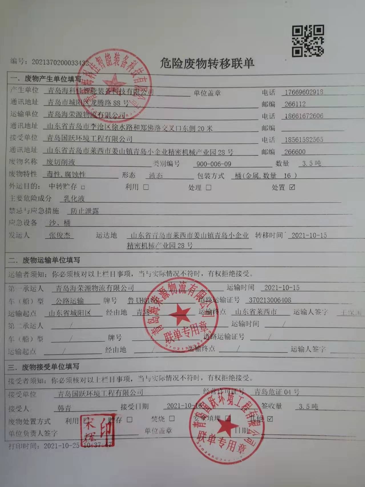 廢物運輸單位:青島海榮源物流有限公司 運輸時間:2021-10-15