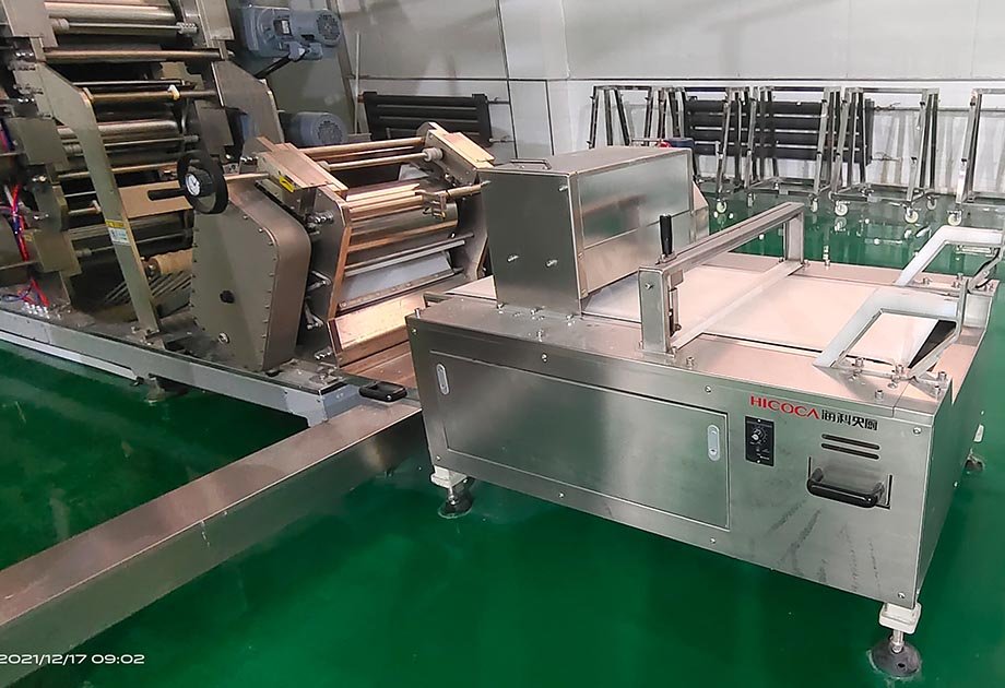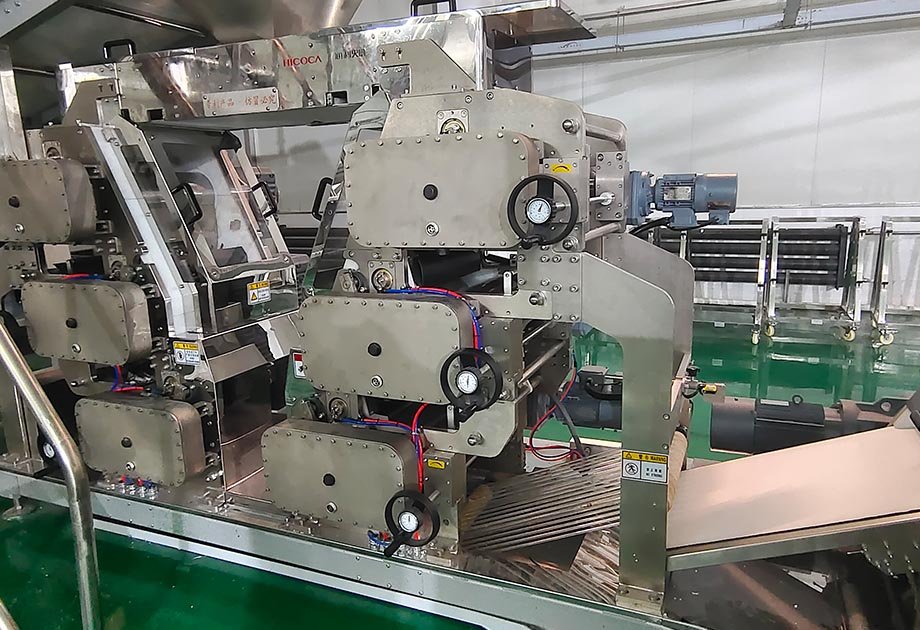 -面帶經過連續壓延輥壓成細密的、達到規定厚度要求的薄面片,形成更為完善的面筋網絡,面帶水分分布更加均勻,面帶具有一定的韌性和強度。