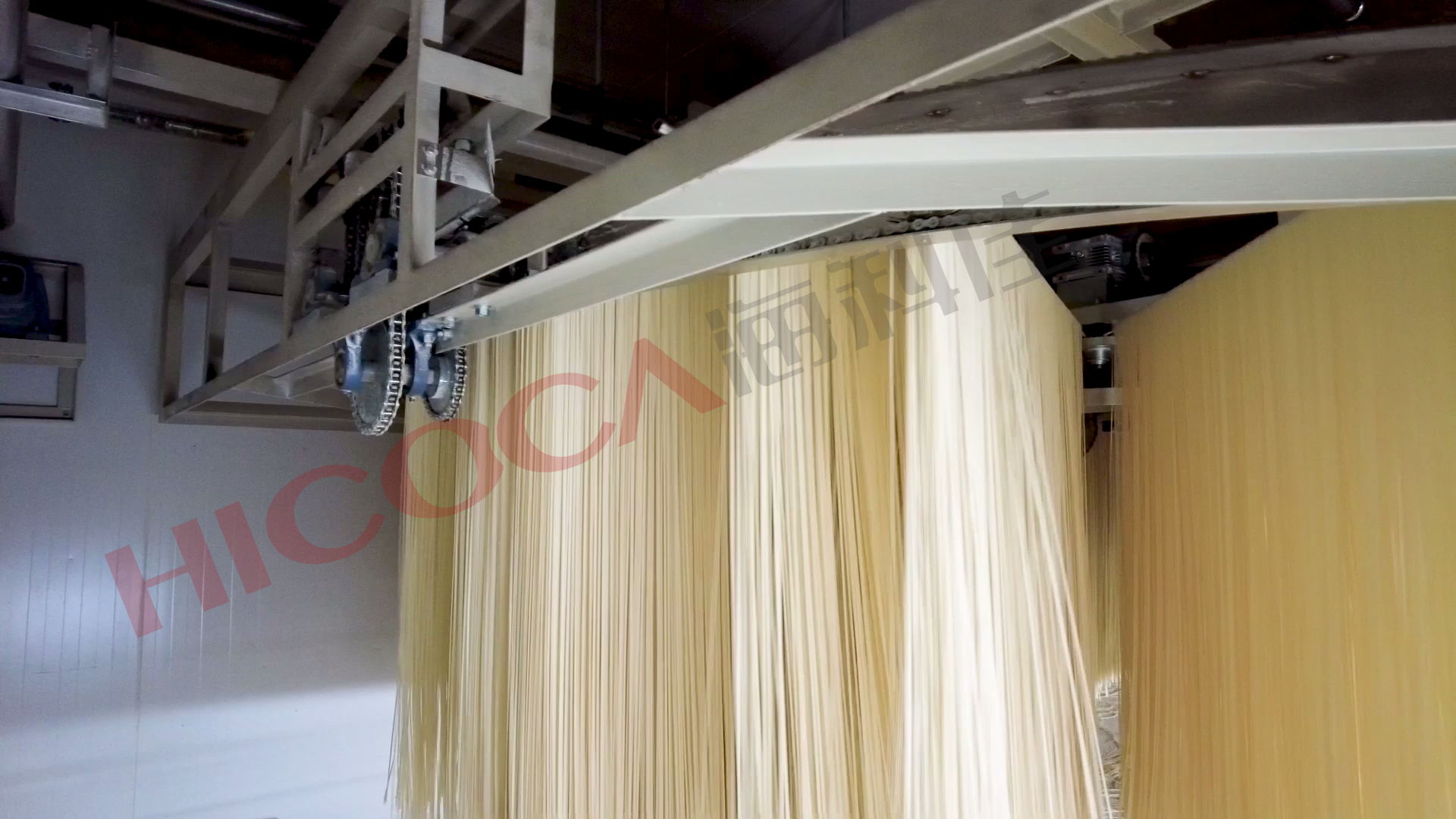 掛面生產(chǎn)線最后烘干區(qū)間設(shè)置不易過短(適宜的區(qū)間長度為烘道總長的25 %-30%),否則烘道尾端與包裝間空氣之間的溫濕度差異過大,掛面極易因驟熱驟冷或回潮吸濕而造成酥條。