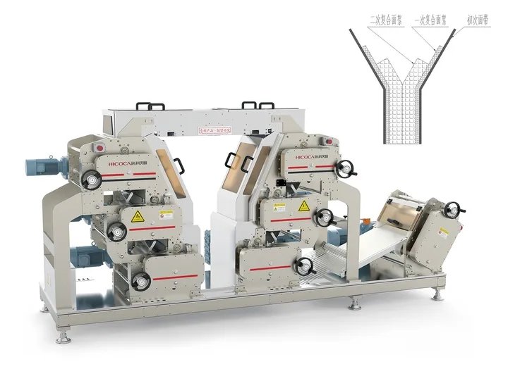 片絮復合壓延技術的靈感來源于市場上一些作坊的制作工作,他們每次在壓延出來的面帶上都會均勻撒上面絮,再進行壓延。這樣的制作工藝在市場上得到了認可。但是傳統做法效率慢,勞動強度大,也無法保證面條質量能夠做到標準統一,更無法保證食品衛(wèi)生安全。把民間的好工藝融入到智能裝備中,實現安全、標準生產,這是海科佳的出發(fā)點。