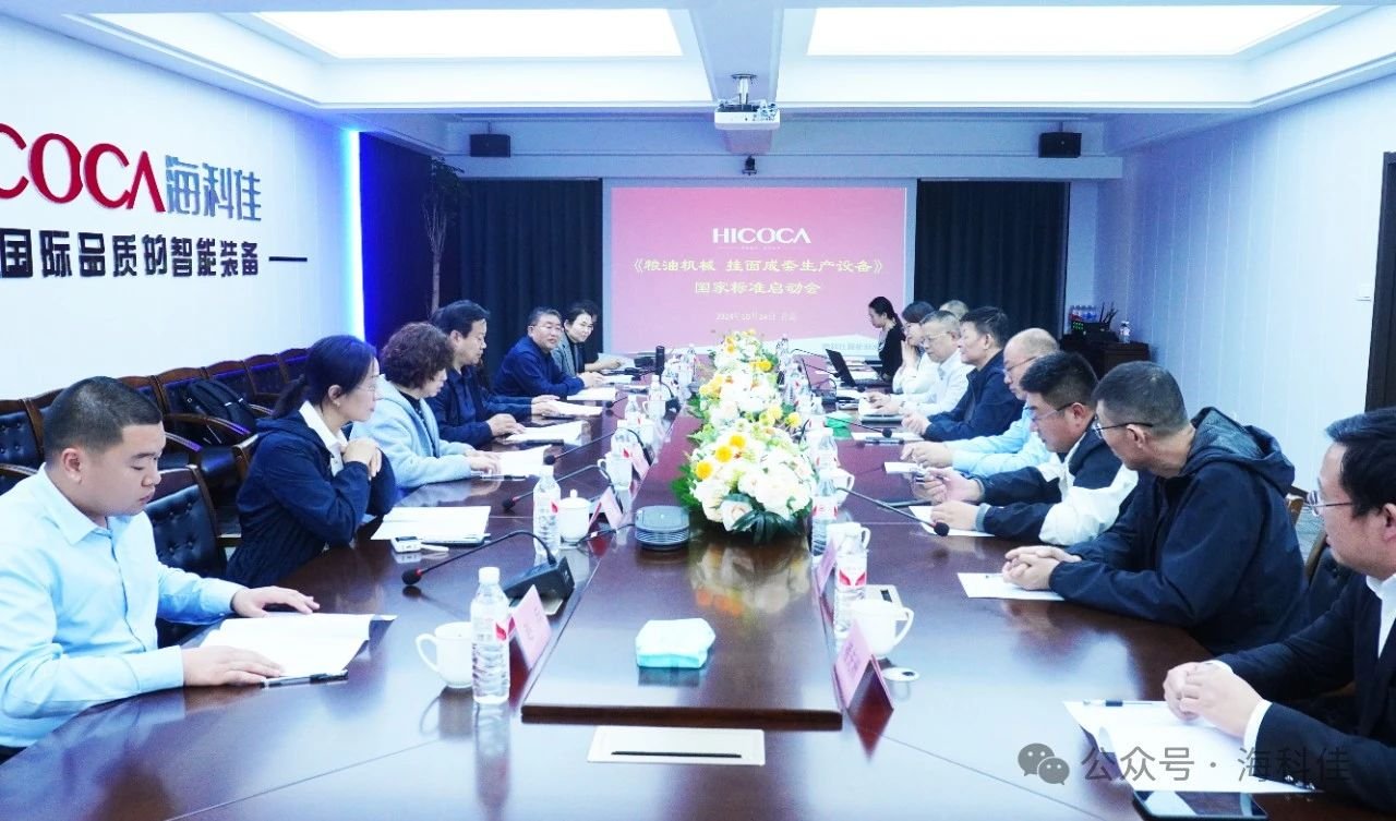 10月24日,《糧油機械 掛面成套生產設備》國家標準研制啟動會在青島海科佳順利召開。青島市市場監督管理局副局長李宗衛,處長高學龍,城陽區市場監督管理局領副局長孫青,山東省糧食行業協會秘書長徐興,青島海科佳智能科技股份有限公司董事長徐龍朝,部分到會企業代表青島天祥食品有限公司、青島品品好糧油集團有限公司、山東百樂麥食品有限公司以及山東省糧油檢測中心、山東標準化協會等單位參加本次啟動會。會議由孫青副局長主持召開。